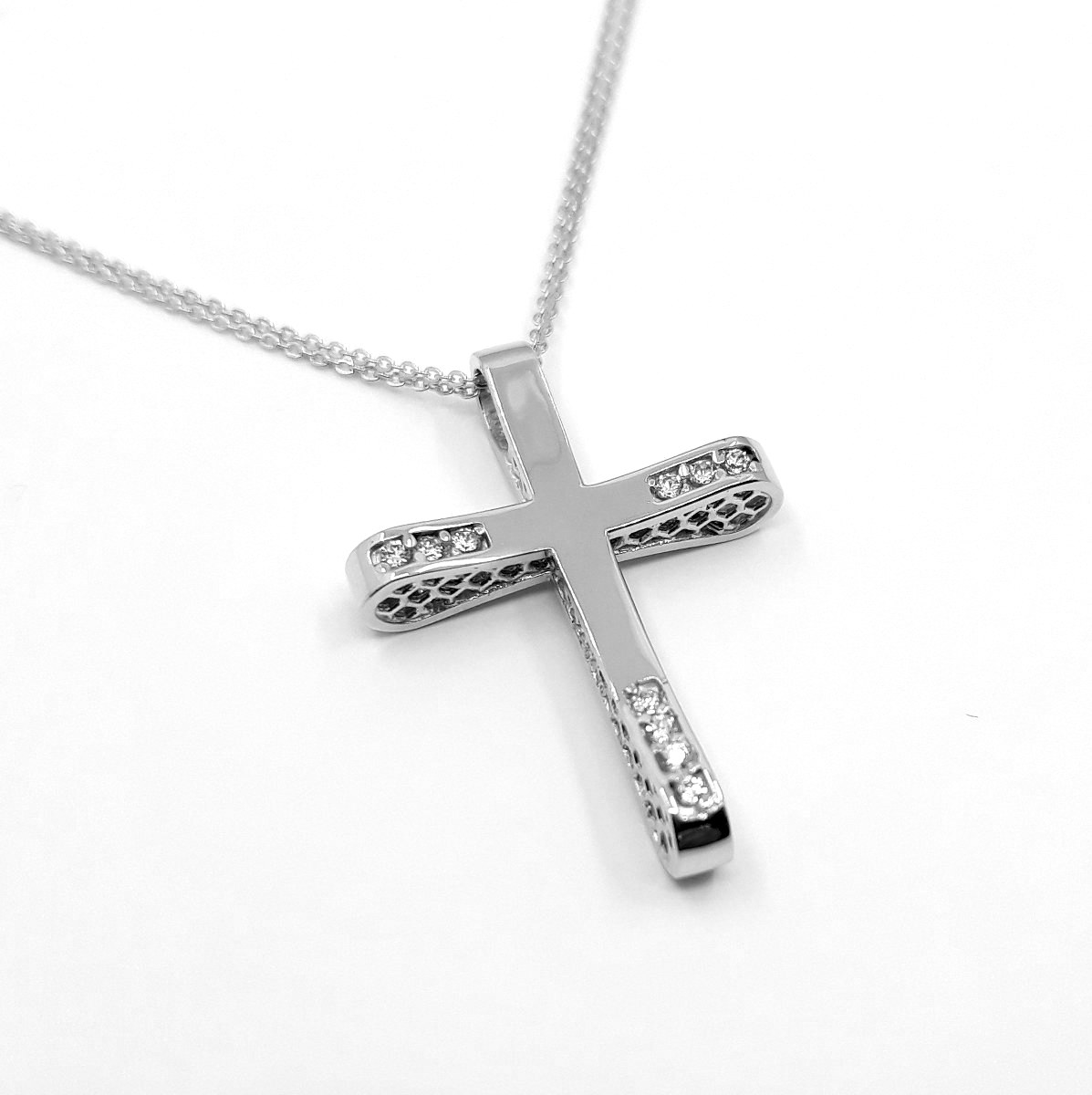 Σταυρός γυναικείος από λευκό χρυσό 14 καρατίων με ζιρκόν και διπλή αλυσίδα.