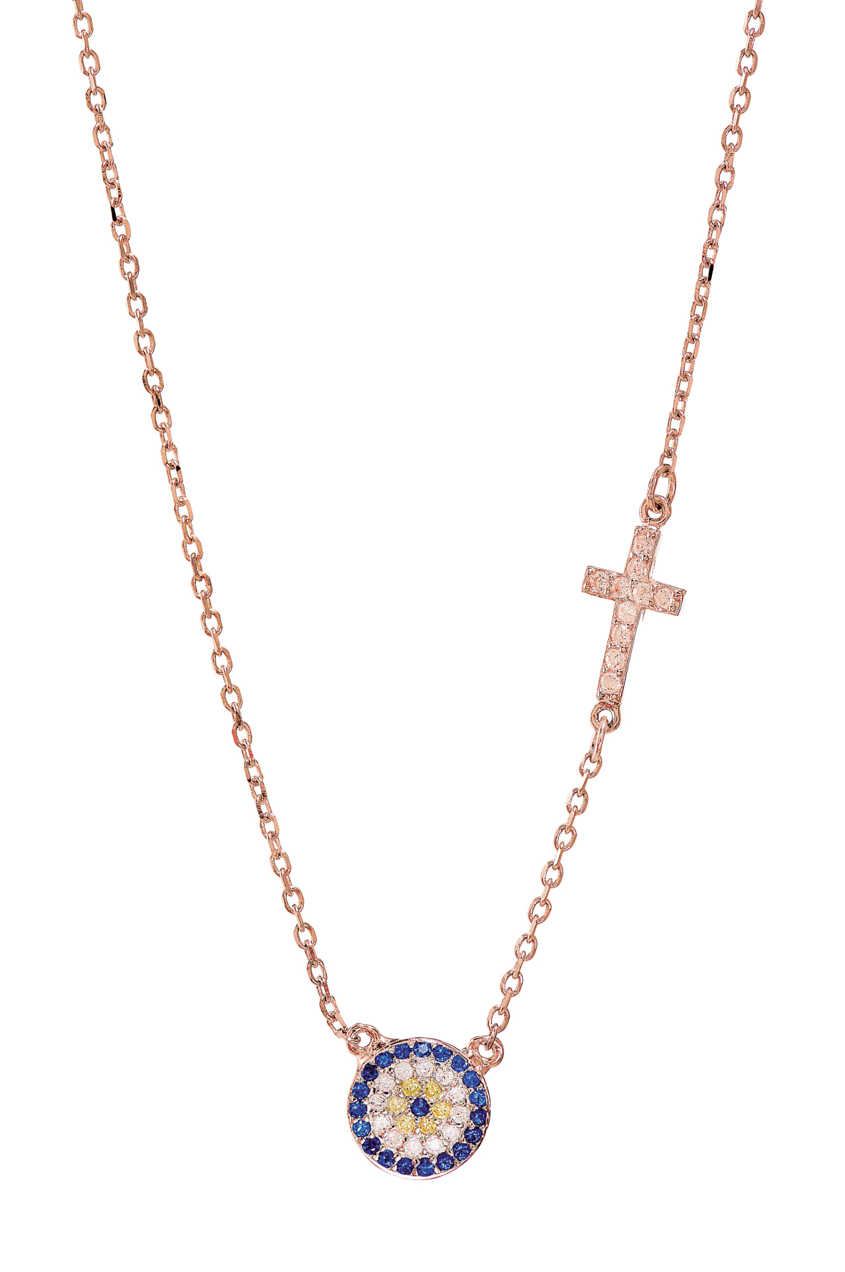 Κολιέ γυναικείο από ασήμι 925° με ροζ επιχρύσωμα, μάτι στόχος με σταυρό στο πλάι.