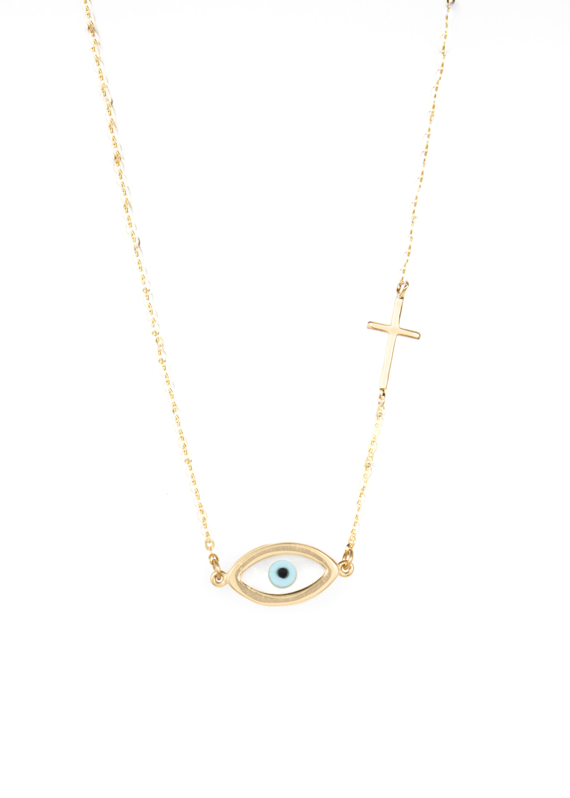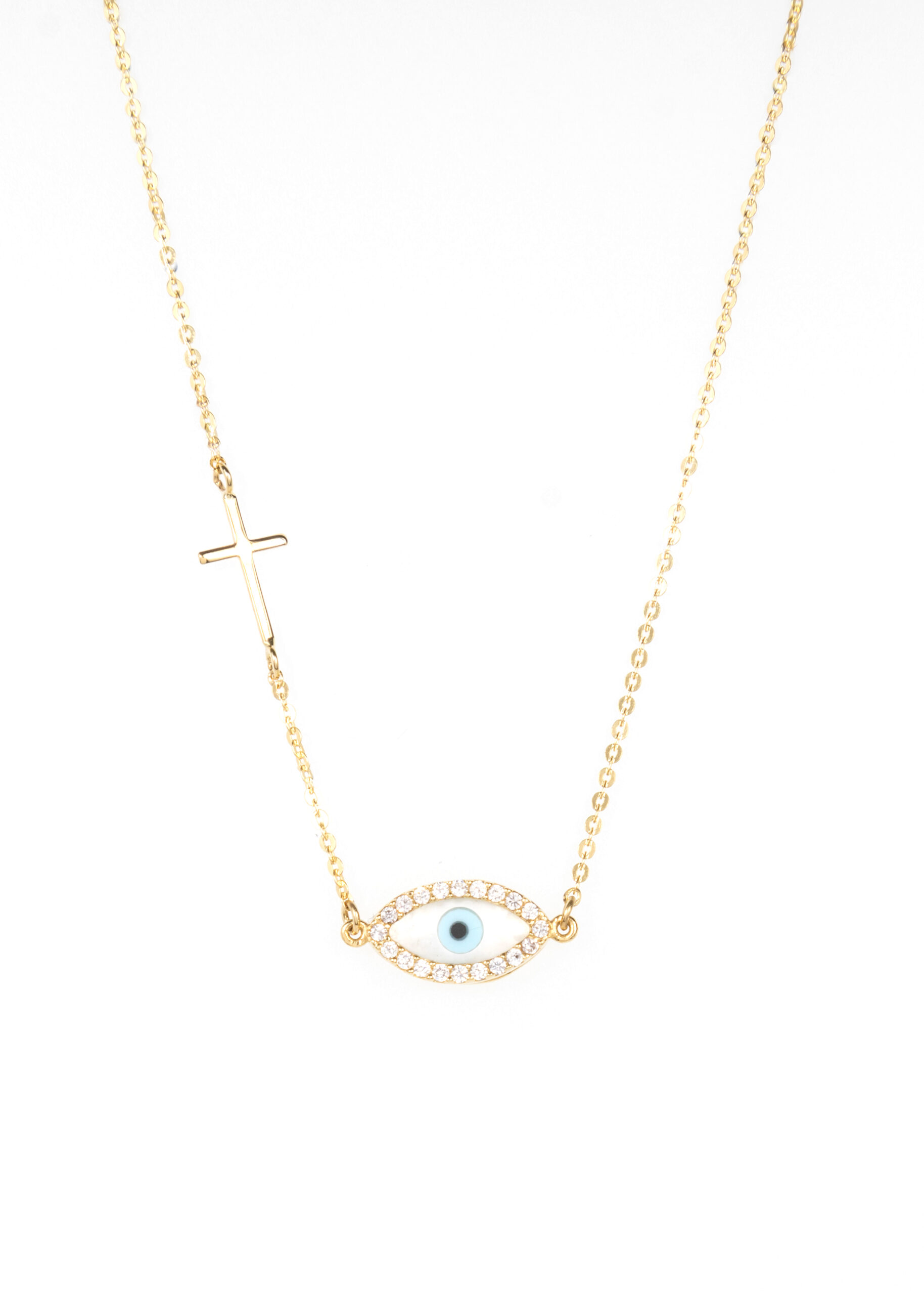 Κολιέ γυναικείο από κίτρινο χρυσό 14 καρατίων μάτι με σταυρό.