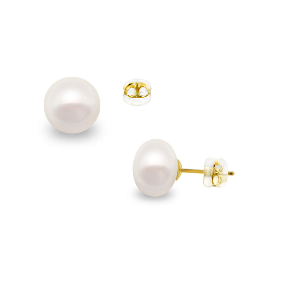 Σκουλαρίκια με λευκά Fresh Water Pearl σε σχήμα Button 8,5-9 χιλιοστών σε Κ14 βάση με κούμπωμα σιλικόνης.